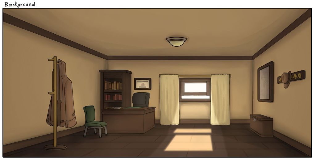 Meeting the boss is set within a small office, where the main character Andrew Mercer holds his meetings. The room contains only the things he deems necessary, with the only light in the room coming from the curtains to help frame his movements.